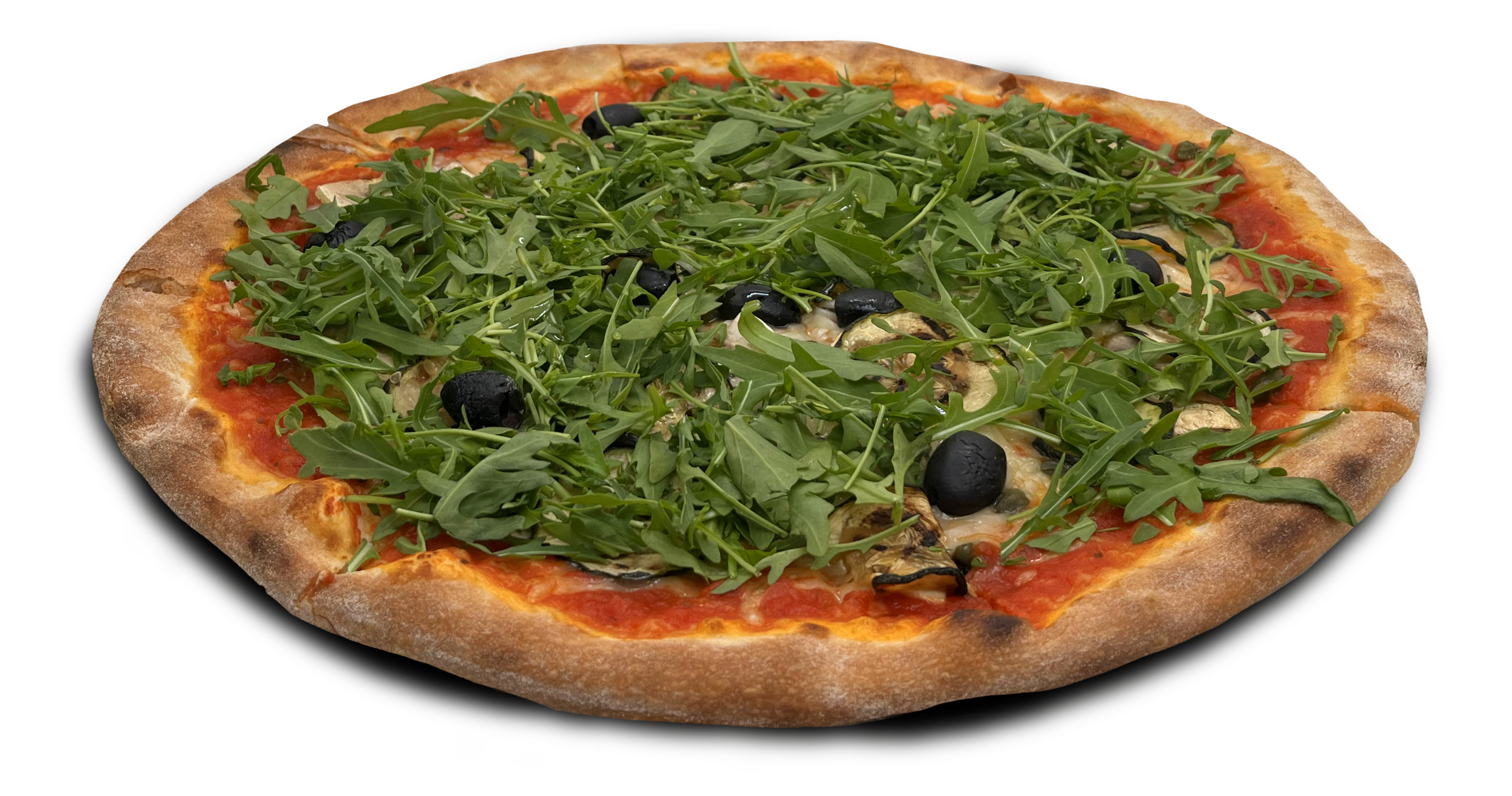 Mozzarella, olijven, kappertjes, champignons, courgette en rucola