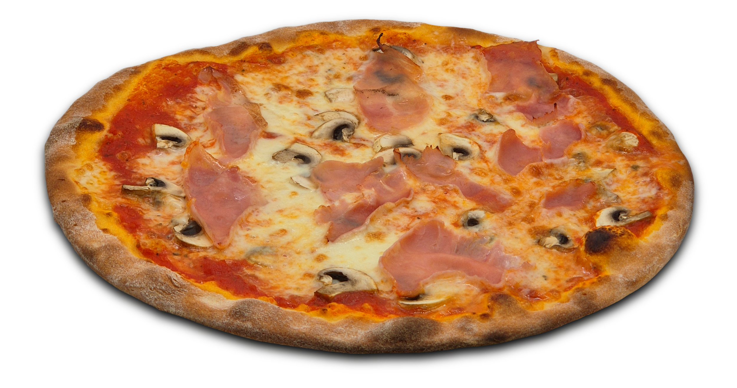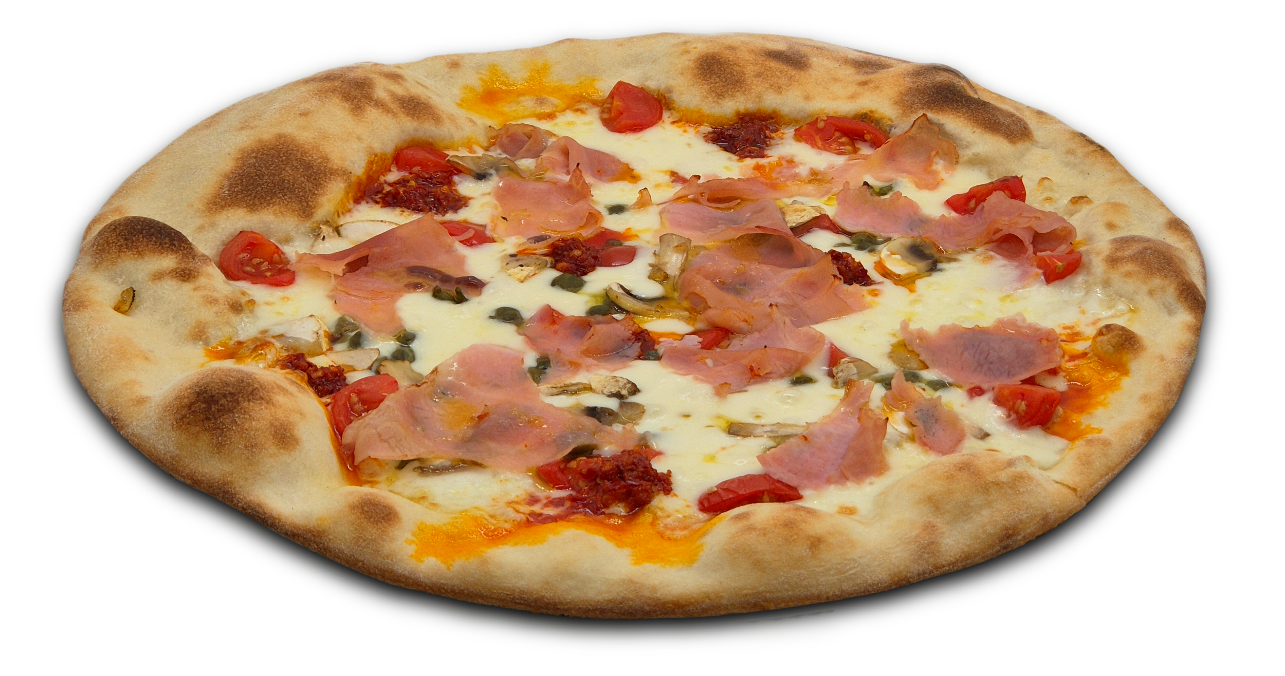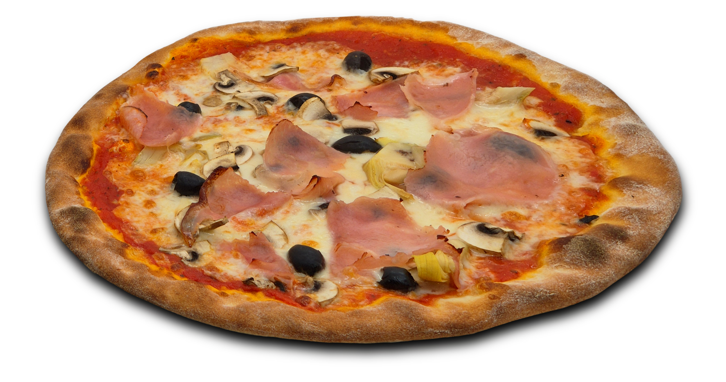 Tomaat, mozzarella, champignons, artisjokken, gekookte ham en olijven.
