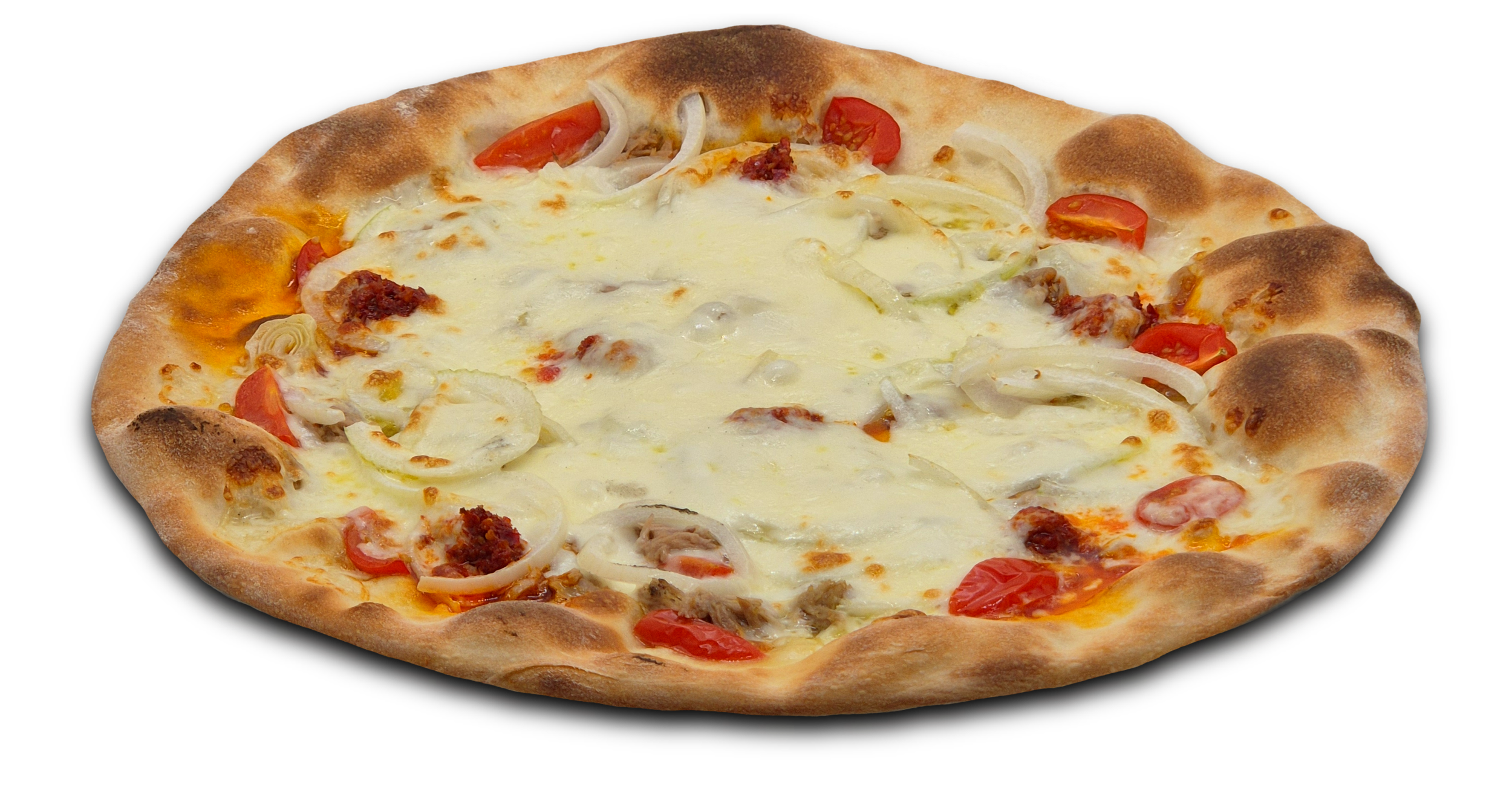 Mozzarella, kerstomaten, ui, tonijn, en N’duja